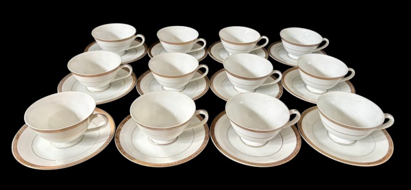 • Doze xicaras para chá em porcelana japosena na cor branca, decorada em tom dourado com padronagem geométrica contínua, além de filete fino próximo à área central. Manufatura no verso.