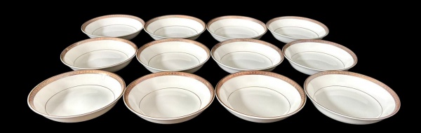 • Doze bowls em porcelana japosena na cor branca, decorada em tom dourado com padronagem geométrica contínua, além de filete fino próximo à área central. Manufatura no verso. Medindo: 14 x 3 cm.