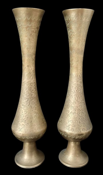 • Par de vasos decorativos em metal dourado, com corpo alongado e elegante em formato de ampulheta, ricamente trabalhados com gravações florais em toda a superfície, borda levemente aberta e base circular estável. Medindo: 35,5 x 9 cm.
