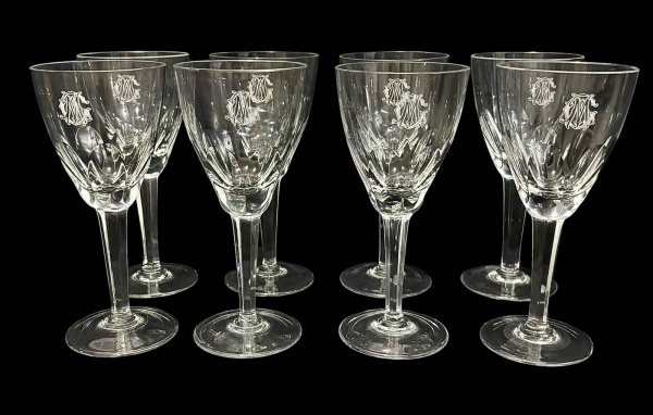 • Oito taças de vinho em cristal translúcido com decoração gravada e monograma. Medindo:  17,5 x 8 cm.