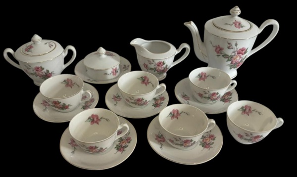 • Conjunto para chá em porcelana nacional, sendo bule, leiteira, açucareiro, manteigueira e 6 xícaras.  Decoração floral em policromia, com delicados buquês e filetes dourados. Medindo: 15,5 x 8 cm; 17,5 x 11,5 x 12 cm; 10 x 15 x 9,5 cm; 23 x 13 x 17,5 cm. Ausência de um pires.