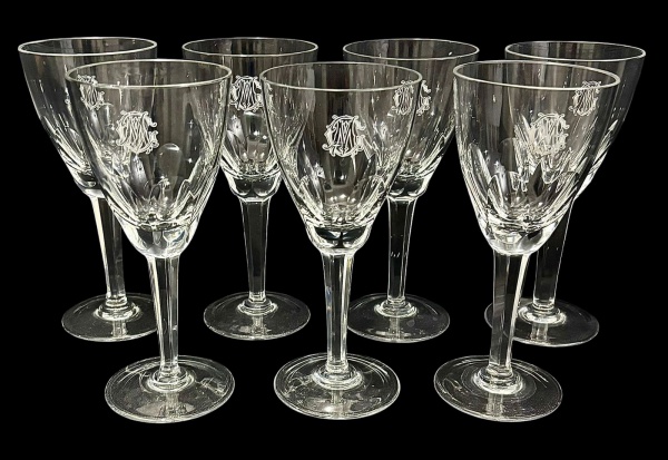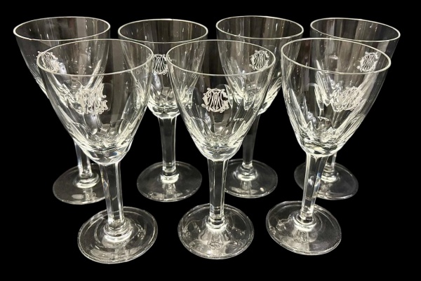 • Sete taças de vinho em cristal translúcido com decoração gravada e monograma. Medindo: 16 x 7,5 cm.