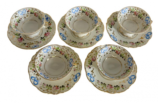 • Vista Alegre - Conjunto de 5 xícaras com pires para chá em porcelana portuguesa. Decoração em policromia com delicados motivos florais, guirlandas e laços em azul, enriquecidos por detalhes em dourado, bordas recortadas com acabamento ondulado.