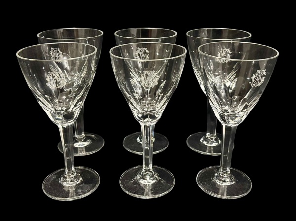• Seis taças de vinho em cristal translúcido com decoração gravada e monograma. Medindo: 16 x 7,5cm.