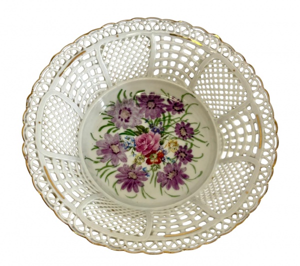 • Hungria. Fruteira em porcelana vazada. Decoração central em policromia com motivos florais, corpo trabalhado em rendilhado vazado e bordas com acabamento em filete dourado. Medindo: 19 x 6 cm.