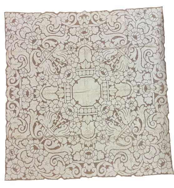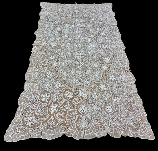 • Toalha de mesa em renda trabalhada. Rica decoração em renda vazada com complexos motivos florais e arabescos, apresentando composição central em destaque e bordas recortadas com acabamento ondulado. Medindo: 300 x 160 cm.