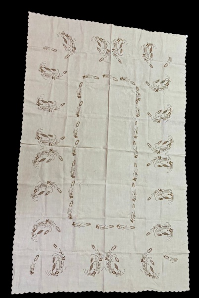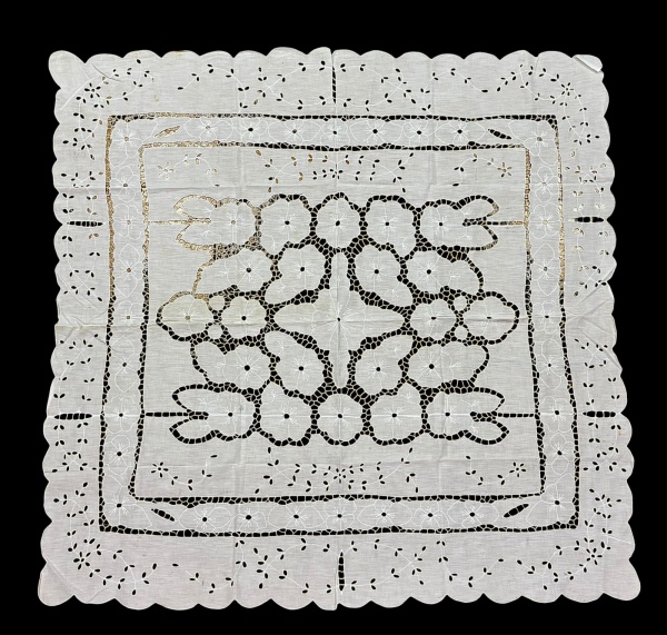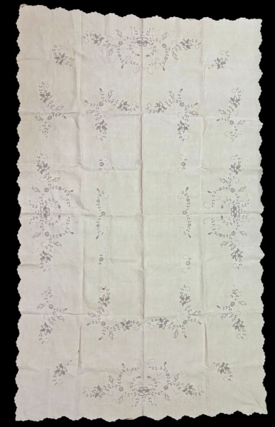• Toalha de mesa em linho bordado e vazado. Delicado trabalho com ricos detalhes florais centrais em recorte vazado, cercados por moldura com bordados finos e pequenas aberturas decorativas, acabamento em bordas onduladas. Medindo: 135 x 140 cm.