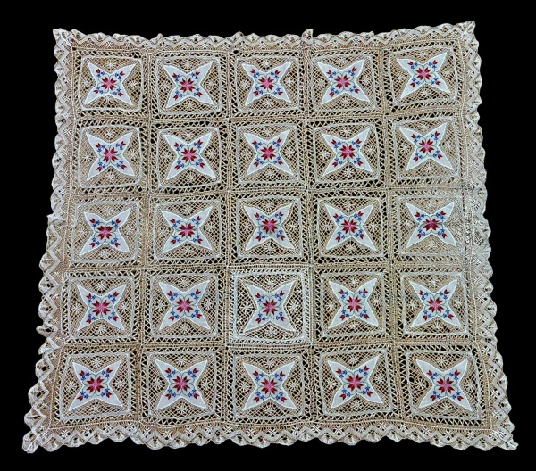 • Toalha de mesa em renda com detalhes bordados. Composta por quadrados com desenho floral no centro em tons de rosa e azul, interligados por renda, com acabamento rendado nas bordas. Medindo: 125 x 130 cm.