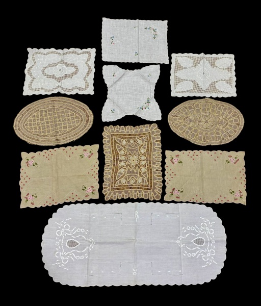 • Conjunto com 10 peças variadas em tecidos e rendas. Lote composto por peças decorativas como toalhinhas e centros de mesa em diferentes formatos, com trabalhos em renda, bordado e tecido liso, apresentando variações de tamanhos e estilos. Itens em bom estado geral, podendo apresentar leves sinais do tempo.