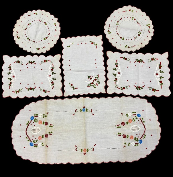 • Conjunto com 6 peças em tecido bordado. Composto por toalhinhas e centro de mesa variados, com bordados florais coloridos e acabamento em bordas onduladas com medidas variadas.