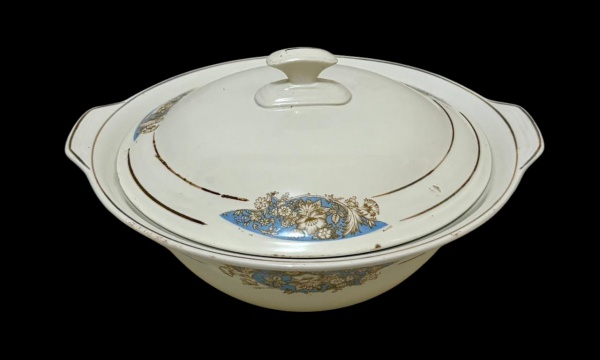 • Real - Sopeira em porcelana. Decoração em policromia com delicados motivos florais distribuídos pela peça, com filetes dourados nas bordas e nas alças.  Medindo: 27 x 23 x 14,5 cm.