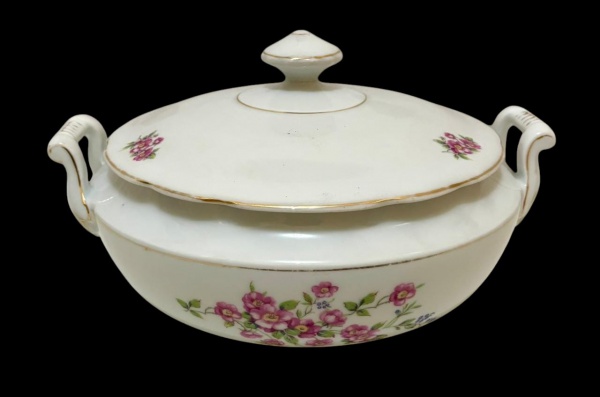 • Real - Sopeira em porcelana nacional com tampa e alças laterais, decorada com flores em tons rosados. Medidas aproximadas: 26,5 x 23 x 15 cm. Marca na base.