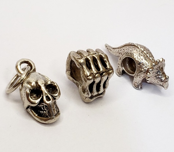 • Vintage Luxo Jóias, Coleção, Lote contendo Berloques em Prata de Lei 925, de Crânio/ Caveira; Esqueleto de uma Mão e um Dinossauro. Peso total 10,43gr
