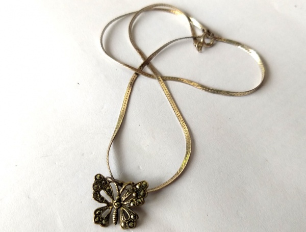 • Vintage Luxo Jóias, Coleção, Cordão Gargantilha em Prata de Lei 925, medindo 40cm com Borboleta em Prata e Marcassitas. Peso total 4,18gr