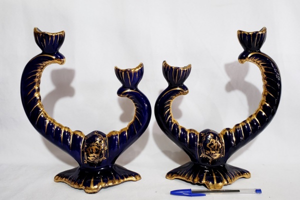 • Decoração - Par de Candelabros Porcelana Azul e ricamente decorado em Ouro, impecáveis, numerados, medindo 23 x 28cm. Assinados Brasil R 223.